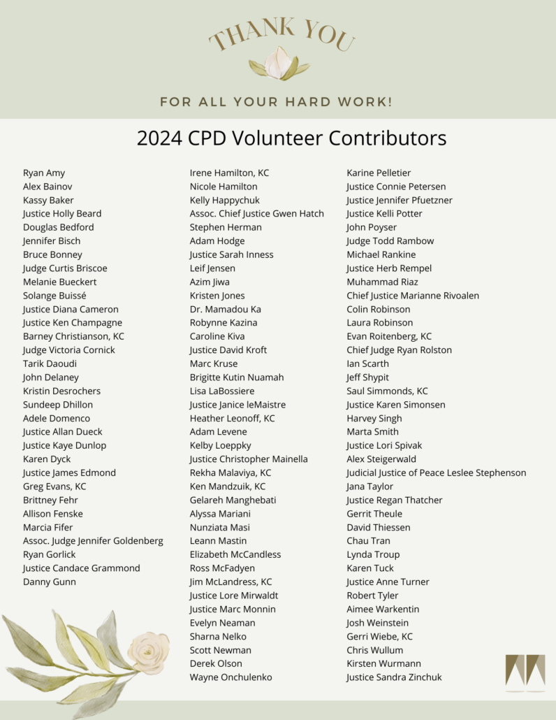 We want to express our deepest appreciation for your expertise, and the time and energy you so generously dedicated in helping the Law Society CPD team educate Manitoba’s legal profession.